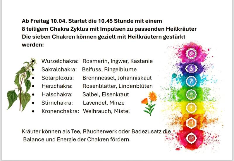 Ab 10. April gibt es 1 neue Yogastunden um 10.45 Uhr bis 12.00 Uhr zum Anfang geht es um die 7 Chakra und ihre Heilkräuter